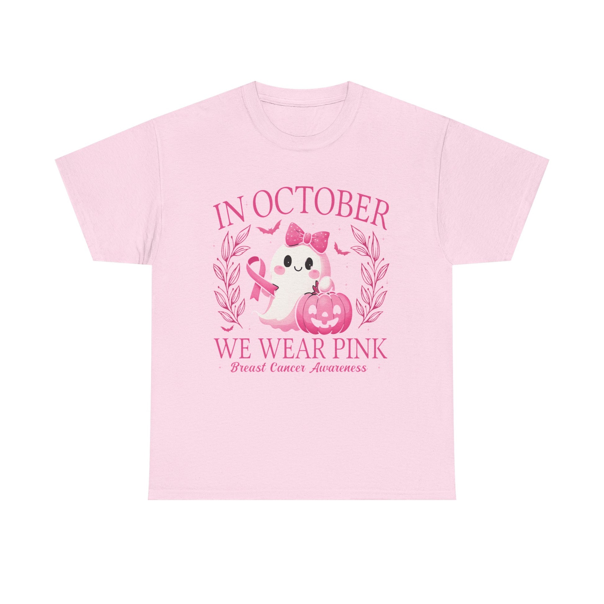 Show your support for breast cancer awareness this October with this adorable and meaningful t-shirt! This charming design perfectly blends Halloween spirit with an important cause, featuring an adorable ghost wearing a sparkly pink bow alongside a sweet pink jack-o'-lantern.