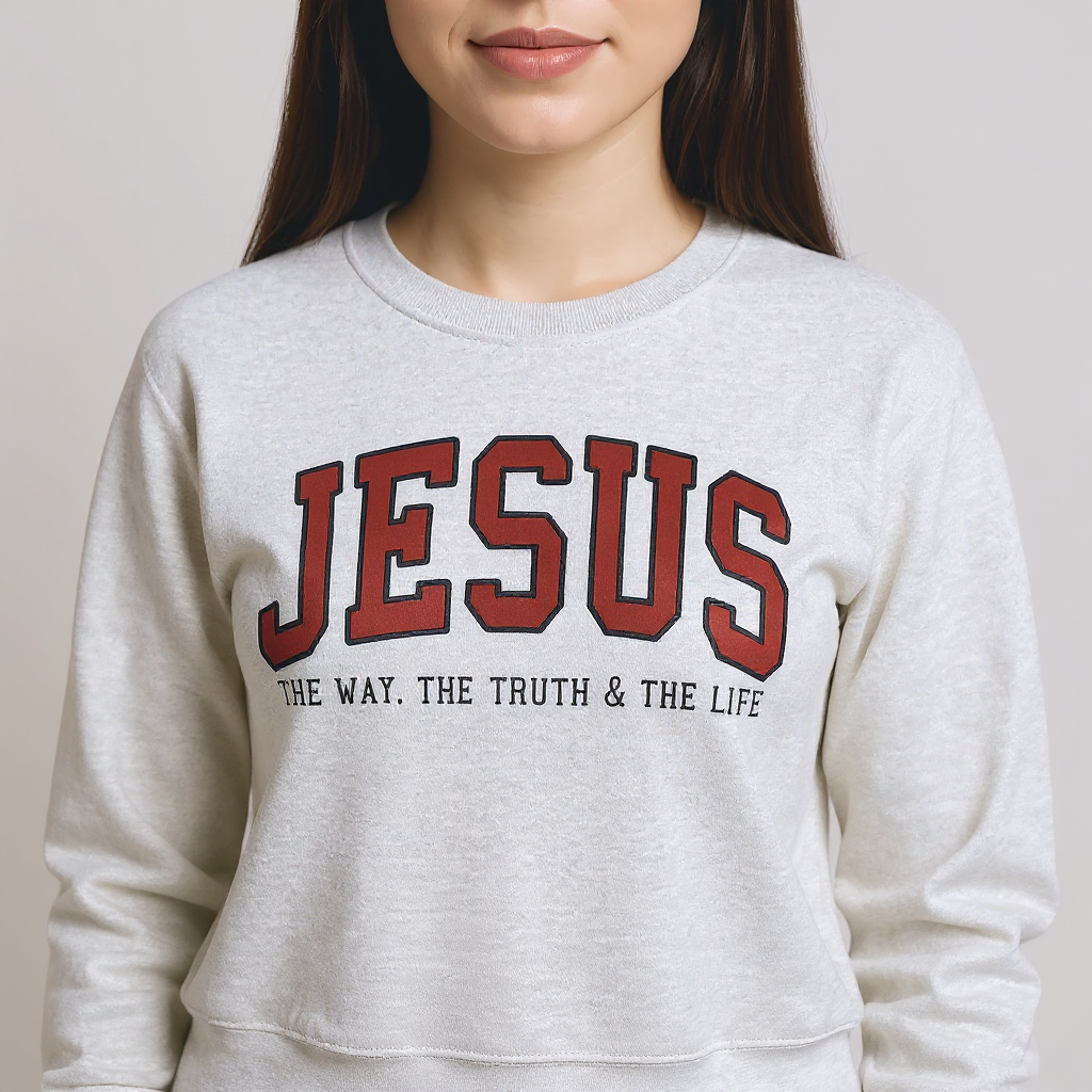 Make a bold statement of faith with this classic varsity-style crewneck. Featuring "JESUS" in striking red collegiate lettering with black outlines, complemented by the powerful reminder "THE WAY, THE TRUTH & THE LIFE" beneath.